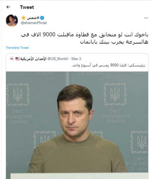 هاجمت الفنانة شمس الكويتية الرئيس الأوكراني فولوديمير زيلينسكي، حيث إتهمته بالكذب في تصريحاتها التي أعلن خلالها إيقاع آلاف القتلى بين صفوف القوات الروسية التي تهاجم أوكرانيا.