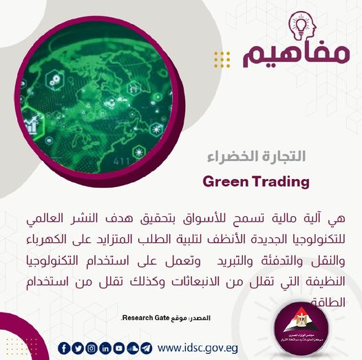 نشر مركز المعلومات ودعم اتخاذ القرار بمجلس الوزراء، اليوم الأربعاء، على صفحته الرسمية عبر أحد مواقع التواصل الاجتماعي “فيس بوك”، إنفوجرافا جديدا يسلط الضوء على التجارة الخضراء، وهي آلية مالية تسمح للأسواق بتحقيق هدف النشر العالمي للتكنولوجيا الجديدة الأنظف لتلبية الطلب المتزايد على الكهرباء والنقل والتدفئة والتبريد، وتعمل على استخدام التكنولوجيا النظيفة التي تقلل من الانبعاثات وكذلك تقلل من استخدام الطاقة.