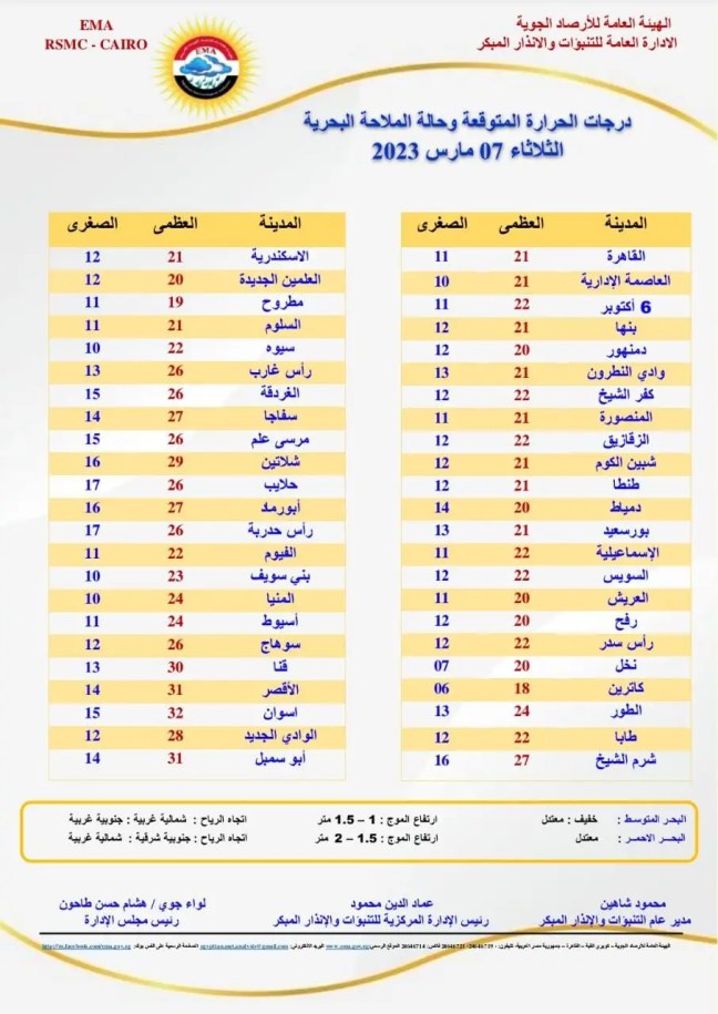 توقعت هيئة الأرصاد الجوية الإدارة العامة للتنبؤات والإنذار المبكر أن يسود طقس مائل للدفء نهارا على القاهرة الكبرى والوجه البحري وشمال الصعيد معتدل الحرارة على السواحل الشمالية، مائل للحرارة على جنوب سيناء، حار على جنوب الصعيد.