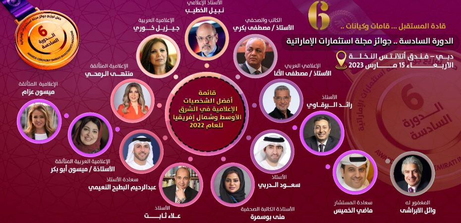 وضمت قائمة أفضل الشخصيات الإعلامية في الشرق الأوسط وشمال إفريقيا للعام 2022: سعادة الأستاذ الفاضل عبدالرحيم البطيح النعيمي مدير عام شركة أبوظبي للإعلام بالإنابة حيث حصد “جائزة” أفضل قيادة مؤسسية في الإعلام المرئي في الشرق الأوسط وشمال إفريقيا، وحصدت الإعلامية العربية المتألقة الأستاذة / ميسون أبو بكر “جائزة” أفضل شخصية في تطوير مسيرة الإعلام المرئي في الشرق الأوسط وشمال إفريقيا للعام 2022. وحصد الكاتب والصحفي الأستاذ / مصطفى بكري رئيس تحرير صحيفة الأسبوع “جائزة” أفضل شخصية عربية في تطوير مسيرة الصحافة في الشرق الأوسط وشمال إفريقيا للعام 2022. كما حصل الإعلامي العربي الأستاذ / مصطفى الآغا قناة أم بي سي”جائزة” أفضل شخصية في تطوير مسيرة الإعلام المرئي في الشرق الأوسط وشمال إفريقيا للعام 2022. وتقديرا لدوره الريادي في الصحافة الاقتصادية ودعم مسيرة الصحافة العربية منحت إدارة المجلة الأستاذ / رائد البرقاوي رئيس تحرير صحيفة الخليج “جائزة” أفضل شخصية في تطوير مسيرة الصحافة الاقتصادية في الشرق الأوسط وشمال إفريقيا للعام 2022 وحصد الإعلامي والكاتب الإماراتي سعود الدربي رئيس مركز الأخبار والنشر رئيس تحرير صحيفة البيان الإماراتية على “جائزة” أفضل شخصية في تطوير مسيرة النشر الصحفي والاخباري في الشرق الأوسط وشمال إفريقيا للعام 2022، وحصدت الكاتبة الصحفية منى بوسمرة رئيسة تحرير صحيفة الإمارات اليوم، على “جائزة” أفضل شخصية عربية في تطوير مسيرة الصحافة في الشرق الأوسط وشمال إفريقيا للعام 2022 حيث استلم الجائزة بالنيابة عنها مدير مكتبها الاستاذ / يوسف أحمد