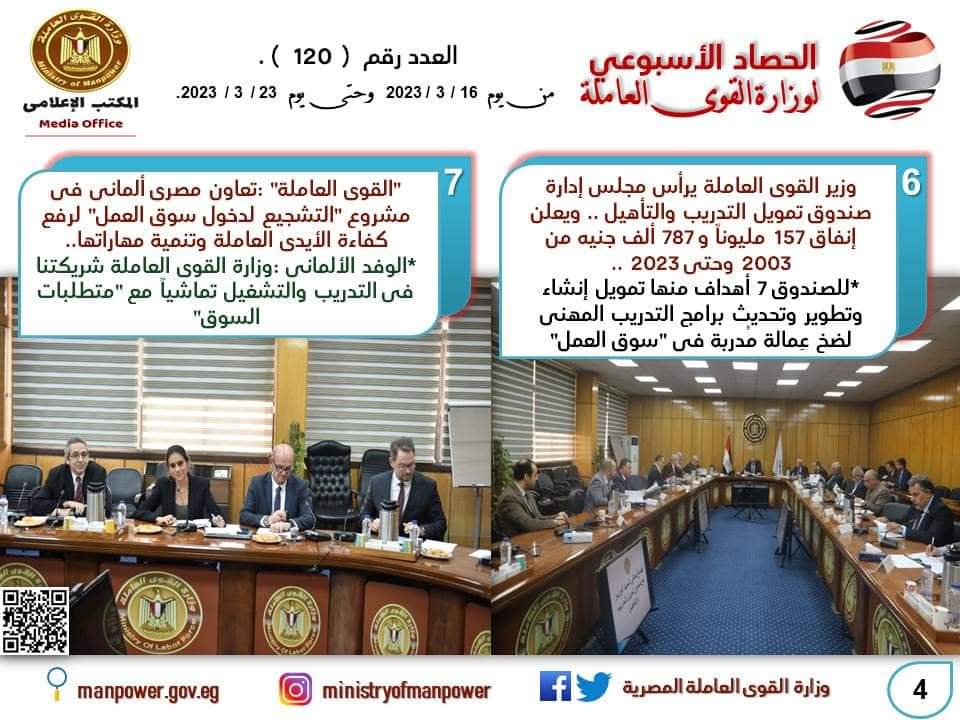رصد “إنفوجراف”عن وزارة القوى العاملة اليوم الجمعة، نشاط “الوزارة”خلال الـ7 أيام الماضية، في الفترة من 17 وحتى 23 مارس الجاري “2023”..وزير القوى العاملة حسن شحاتة اختتم هذا الأسبوع بإعلان البث التجريبي للبوابة الجيومكانية لرقمنة “خدمات الوزارة” ،كما عقد “الوزير”جلسة حوارية مع خريجي برامج تدريب مهني.. وشهد “الوزير”احتفالية “الوزارة” بعيد الأسرة المصرية، وسلم دروع لـ55 من الأمهات المِثاليات..وأب مِثالى..كما ترأس مجلس إدارة صندوق إعانات الطوارئ للعمال الذى اعلن فيه إنفاق 2 مليار و 188 مليوناً و700 ألف جنيه إعانات للعمال منذ 2003 حتى الأن ، وكذلك مجلس إدارة صندوق تمويل التدريب والتأهيل والذي رصد حجم الإنفاق على تمويل التدريب منذ التأسيس وحتى الآن ..واعلنت “الوزارة ” عن فرص العمل من خلال نشرة التوظيف نصف الشهرية..وواصلت مديريات القوى العاملة بالمحافظات تنفيذ خطة تدريب الشباب على مهن يحتاجها سوق العمل..كما عادت مستحقات جديدة لعمالة مصرية في الخارج.