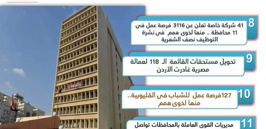 أعلنت وزارة القوى العاملة في بيان لها عن تلقيها طلبات من 41 شركة قطاع خاص في 11 محافظة لشغل 3116 وظيفة خالية، في عدد من التخصصات، منها لذوى القدرات الخاصة، برواتب تبدأ من 2700 جنيه شهريا ، فضلا عن التأمين الصحي والاجتماعي،وذلك للتقديم عليها خلال شهري مارس وأبريل 2023.
