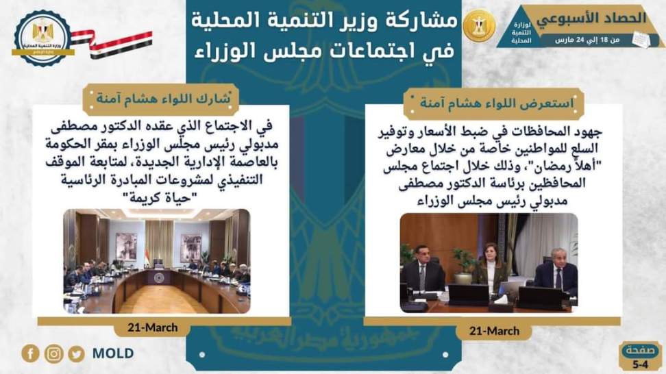أصدر المركز الإعلامي، التابع لوزارة التنمية المحلية، ” الانفوجراف الأسبوعي” في نسخته الـ ٢٧ حول حصاد أهم الأنشطة والفعاليات التي قام بها اللواء هشام آمنة وزير التنمية المحلية، خلال الأسبوع الماضي في الفترة من ١٨ إلي ٢٤ مارس الجاري، حيث نستعرض أبرزها في التقرير التالي الذي نشرته الصفحة الرسمية لوزارة التنمية المحلية علي موقع التواصل الاجتماعي “فيس بوك” من خلال انفوجراف يرصد أبرز تلك الأنشطة التي جاءت كالتالي: