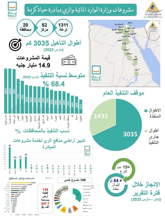 وأوضح سيادته أنه تم ويجرى تأهيل ترع بأطوال إجمالية ٤٤٦٦ كيلومتر بمراكز حياه كريمة ، حيث بلغت أطوال الترع التى تم نهو تأهيلها حوالى ٣٠٣٥ كيلومتر ، وجارى العمل في ترع بأطوال تصل إلى ١٤٣١ كيلومتر ، كما يجرى تنفيذ عدد (٤) عمليات للحماية من أخطار السيول بمحافظة الجيزة تشتمل على إنشاء بحيرات وحواجز وسدود إعاقة وأحواض تهدئة .