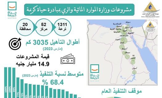 كما قامت الوزارة بتدبير عدد (١٣٤) قطعة من الأراضى من منافع الري بمساحة تجاوز ٢٤٨ ألف متر مربع بمحافظات (سوهاج ، المنوفية ، قنا ، المنيا ، دمياط ، أسوان ، الأقصر ، أسيوط ، البحيرة ، الدقهلية ، كفر الشيخ ، بنى سويف ، الإسماعيلية ، الفيوم ، الجيزة ، القليوبية) ، وذلك لإقامة عدد (١٤٩) مشروع خدمي في إطار المبادرة مثل (مراكز شباب – محطات رفع – محطات معالجة – مدارس – وحدات صحية – نقاط إسعاف – نقاط شرطة – مطافئ – مجمعات خدمية ومكاتب بريد – مواقف – جمعيات زراعية – مجمعات خدمية وزراعية) ، وكان لمحطات الرفع الخاصة بمشروعات الصرف الصحي النصيب الأكبر من الأراضي المتوفرة بعدد (٥٢) قطعة أرض تلاها المواقف النموذجية (١٦ قطعة) ، مراكز الشباب (١٤ قطعة) ، المراكز الطبية (١٠ قطع) ، الأسواق الحضرية (٩ قطع) ، المدارس (٧ قطع) ، وحدات الإسعاف (٥ قطع) ، الوحدات البيطرية (٤ قطع) ، ملاعب (٤ قطع)