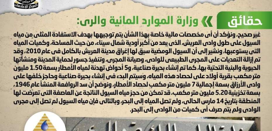 تداولت بعض وسائل الإعلام والمواقع الإلكترونية وصفحات التواصل الاجتماعي أنباء بشأن إهدار مليارات الجنيهات على إنشاء حواجز الحماية من أخطار السيول على طول وادي العريش دون تحقيق أي استفادة من مياه الأمطار، وقد قام المركز الإعلامي لمجلس الوزراء بالتواصل مع وزارة الموارد المائية والري، والتي نفت تلك الأنباء، مُؤكدةً أنه لا صحة لإهدار مليارات الجنيهات على إنشاء حواجز الحماية من أخطار السيول على طول وادي العريش دون تحقيق أي استفادة من مياه الأمطار، وأن أي مخصصات مالية خاصة بهذا الشأن يتم توجيهها بهدف الاستفادة المثلى من مياه السيول على طول وادي العريش، الذي يعد من أكبر أودية شمال سيناء، من حيث المساحة، وكميات المياه التي يستوعبها، مُشيرةً إلى أن السيول الومضية سبق لها إغراق مدينة العريش بالكامل في عام ٢٠١٠، وقد تم إزالة التعديات على المجرى الطبيعي للوادي، وصيانة المجرى، وتنفيذ جسور لحماية المدينة ومنشآتها الحيوية والبنية التحتية بها، كما تم إنشاء بحيرة صناعية، و٥ أحواض تهدئة لمياه الأمطار بسعة ١.٥٠ مليون متر مكعب بقرية أولاد علي لحصاد هذه المياه، وسيتم البدء في إنشاء بحيرة صناعية وحاجز خلفها على وادي الأرزاق بسعة إجمالية ٧ مليون متر مكعب لحصاد الأمطار، مُوضحةً أن سد الروافعة المنشأ عام ١٩٤٦ بسعة تخزينية ٥.٢٠ مليون متر مكعب، قد تمكن من حجز مياه السيول الناتجة عن العاصفة، التي تعرضت لها المنطقة بتاريخ ١٤ مارس الحالي، ولم تصل المياه إلى البحر، وبالتالي فإن مياه السيول لم تصل إلى مجرى الوادي ولم يتم صرف أي كميات من الوادي إلى البحر.