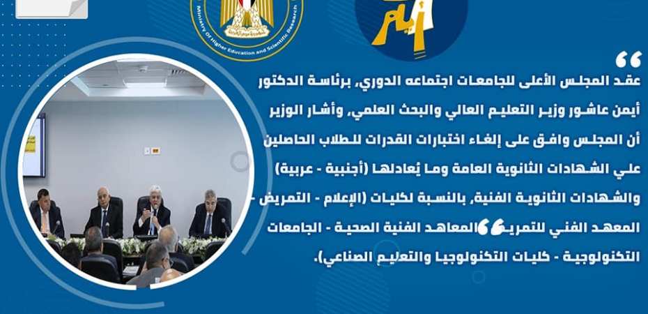 1) عقد المجلس الأعلى للجامعات اجتماعه الدوري، برئاسة الدكتور أيمن عاشور وزير التعليم العالي والبحث العلمي، وأشار الوزير أن المجلس وافق على إلغاء اختبارات القدرات للطلاب الحاصلين علي الشهادات الثانوية العامة وما يُعادلها (أجنبية – عربية) والشهادات الثانوية الفنية، بالنسبة لكليات (الإعلام – التمريض – المعهد الفني للتمريض – المعاهد الفنية الصحية – الجامعات التكنولوجية – كليات التكنولوجيا والتعليم الصناعي).