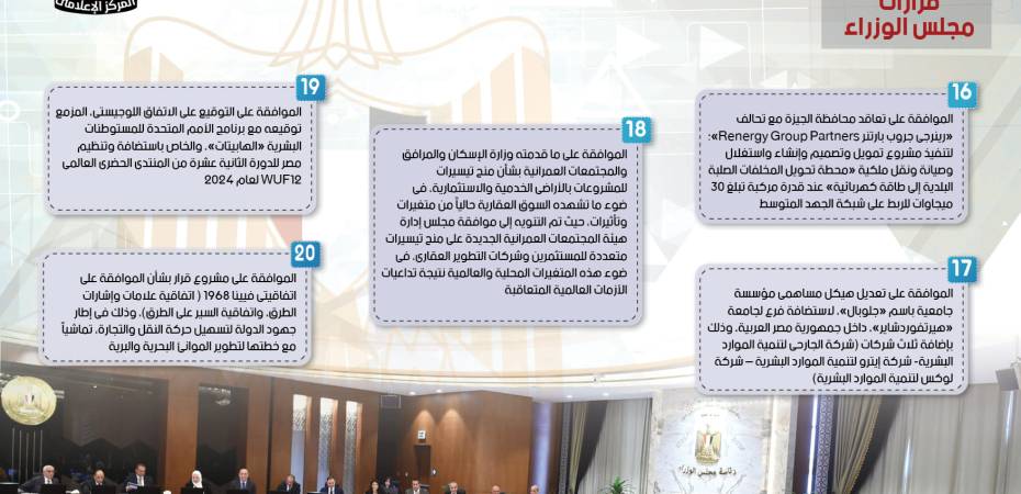 واستكمالاً لقرارات السيد رئيس مجلس الوزراء فبحسب التقرير تمت الموافقة على مشروع قرار بشأن اتفاقيات التمويل التي وقعتها وزارة النقل ممثلة في الهيئة القومية للأنفاق، والمقدمة من عدة بنوك أوروبية، لتمويل مشروع إنشاء الخط الأول لشبكة القطار الكهربائي السريع (العين السخنة – الإسكندرية – العلمين – مطروح)، بالإضافة إلى الموافقة على مشروع قرار بتعديل بعض أحكام قرار رئيس الجمهورية رقم 561 لسنة 2019 بإنشاء مؤسسة جامعية باسم “جلوبال”، لاستضافة فرع لجامعة “هيرتفوردشاير”، داخل جمهورية مصر العربية، وذلك بإضافة 31 برنامجاً دراسياً جديداً، فضلاً عن الموافقة على تعديل هيكل مساهمي مؤسسة جامعية باسم “جلوبال”، لاستضافة فرع لجامعة “هيرتفوردشاير”، داخل جمهورية مصر العربية، وذلك بإضافة ثلاث شركات (شركة الجارحى لتنمية الموارد البشرية- شركة إيترو لتنمية الموارد البشرية – شركة لوكس لتنمية الموارد البشرية)، بجانب الموافقة على مشروع قرار بشأن الموافقة على اتفاقيتي فيينا 1968 (اتفاقية علامات وإشارات الطرق، واتفاقية السير على الطرق)، وذلك في إطار جهود الدولة لتسهيل حركة النقل والتجارة، تماشياً مع خطتها لتطوير الموانئ البحرية والبرية، وكذلك الموافقة على ما قدمته وزارة الإسكان والمرافق والمجتمعات العمرانية بشأن منح تيسيرات للمشروعات بالأراضي الخدمية والاستثمارية، في ضوء ما تشهده السوق العقارية حالياً من متغيرات وتأثيرات، حيث تم التنويه إلى موافقة مجلس إدارة هيئة المجتمعات العمرانية الجديدة على منح تيسيرات متعددة للمستثمرين وشركات التطوير العقاري، في ضوء هذه المتغيرات المحلية والعالمية نتيجة تداعيات الأزمات العالمية المتعاقبة، بجانب الموافقة على التوقيع على الاتفاق اللوجيستي، المزمع توقيعه مع برنامج الأمم المتحدة للمستوطنات البشرية “الهابيتات”، والخاص باستضافة وتنظيم مصر للدورة الثانية عشرة من المنتدى الحضري العالمي WUF12 لعام 2024.