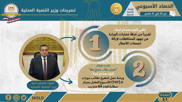 أصدر المركز الإعلامي، التابع لوزارة التنمية المحلية، ” الانفوجراف الأسبوعي” في نسخته الـ 28 حول حصاد أهم الأنشطة والفعاليات التي قام بها اللواء هشام آمنة وزير التنمية المحلية، خلال الأسبوع الماضي في الفترة من 25 إلي 31 مارس الجاري، حيث نستعرض أبرزها في التقرير التالي الذي نشرته الصفحة الرسمية لوزارة التنمية المحلية علي موقع التواصل الاجتماعي “فيس بوك” من خلال انفوجراف يرصد أبرز تلك الأنشطة التي جاءت كالتالي: