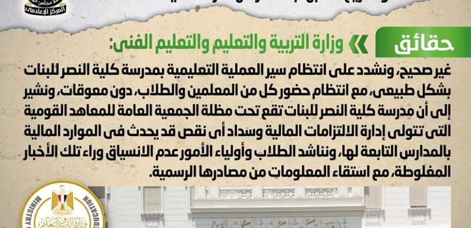 تداولت بعض المواقع الإلكترونية وصفحات التواصل الاجتماعي أنباء بشأن إغلاق مدرسة كلية النصر للبنات (EGC) بالإسكندرية وتسريح طلابها بعد تعرضها لأزمة مالية، وقد قام المركز الإعلامي لمجلس الوزراء بالتواصل مع وزارة التربية والتعليم والتعليم الفني، والتي نفت تلك الأنباء، مُؤكدةً أنه لا صحة لإغلاق مدرسة كلية النصر للبنات (EGC) بالإسكندرية وتسريح طلابها بعد تعرضها لأزمة مالية، مُشددةً على انتظام سير العملية التعليمية بمدرسة كلية النصر للبنات بشكل طبيعي، مع انتظام حضور كل من المعلمين والطلاب، دون معوقات، مُشيرةً إلى أن مدرسة كلية النصر للبنات تقع تحت مظلة الجمعية العامة للمعاهد القومية التي تتولى إدارة الالتزامات المالية وسداد أي نقص قد يحدث في الموارد المالية بالمدارس التابعة لها، مُناشدةً الطلاب وأولياء الأمور عدم الانسياق وراء تلك الأخبار المغلوطة، مع استقاء المعلومات من مصادرها الرسمية.