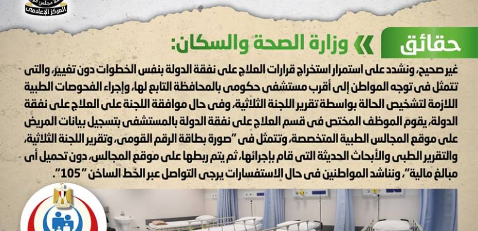 تداولت بعض المواقع الإلكترونية وصفحات التواصل الاجتماعي أنباء بشأن تغيير خطوات استخراج قرارات العلاج على نفقة الدولة، وقد قام المركز الإعلامي لمجلس الوزراء بالتواصل مع وزارة الصحة والسكان، والتي نفت تلك الأنباء، مُؤكدةً أنه لا صحة لتغيير خطوات استخراج قرارات العلاج على نفقة الدولة، مُشددةً على استمرار استخراج قرارات العلاج على نفقة الدولة بنفس الخطوات دون تغيير، والتي تتمثل في توجه المواطن إلى أقرب مستشفى حكومي بالمحافظة التابع لها، وإجراء الفحوصات الطبية اللازمة لتشخيص الحالة بواسطة تقرير اللجنة الثلاثية، وفي حال موافقة اللجنة على العلاج على نفقة الدولة، يقوم الموظف المختص في قسم العلاج على نفقة الدولة بالمستشفى بتسجيل بيانات المريض على موقع المجالس الطبية المتخصصة، وتتمثل في “صورة بطاقة الرقم القومي، وتقرير اللجنة الثلاثية، والتقرير الطبي والأبحاث الحديثة التي قام بإجرائها، ثم يتم ربطها على موقع المجالس، دون تحميل أي مبالغ مالية”، مُناشدةً المواطنين في حال الاستفسارات يرجى التواصل عبر الخط الساخن ” 105″.