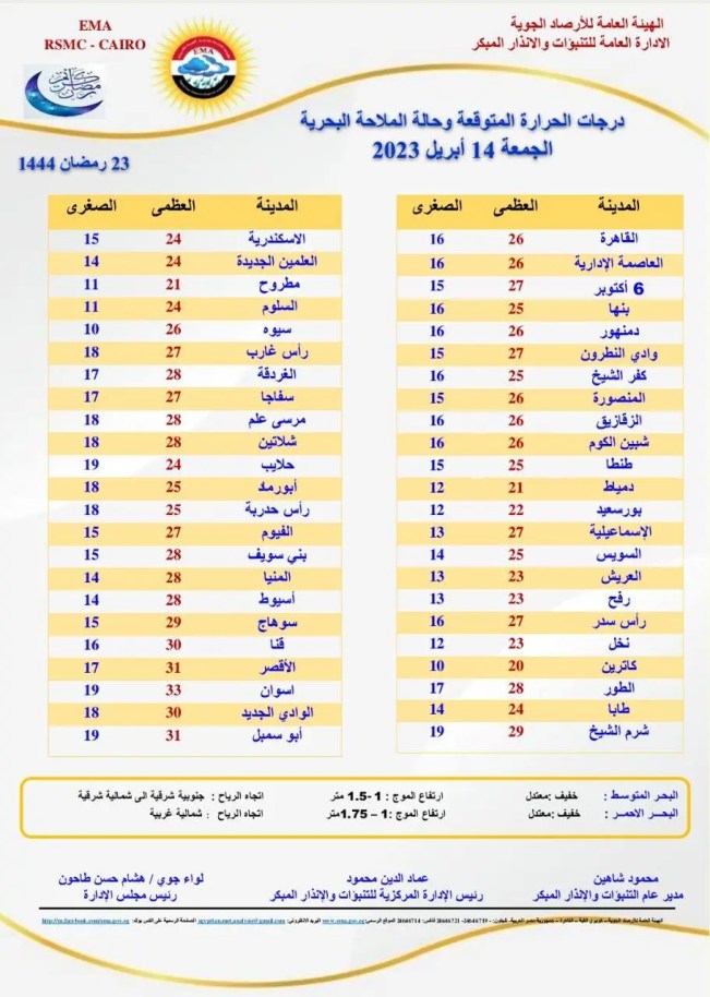 توقعت الهيئة العامة للأرصاد الجوية الإدارة العامة للتنبؤات والإنذار المبكر أن يسود حالة الطقس غدا الجمعة مائل للبرودة صباحًا مائل للحرارة نهارًا على القاهرة الكبري والوجه البحري وجنوب سيناء وشمال الصعيد مائل للدفء على السواحل الشمالية، حارعلى جنوب الصعيد، بارد ليلًا على شمال البلاد حتي القاهرة الكبري وشمال الصعيد مائل للبردوة علي جنوب سيناء وجنوب الصعيد.