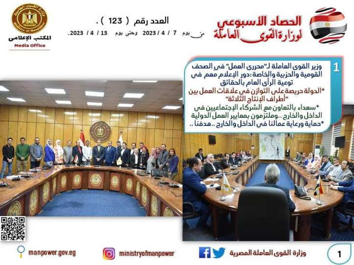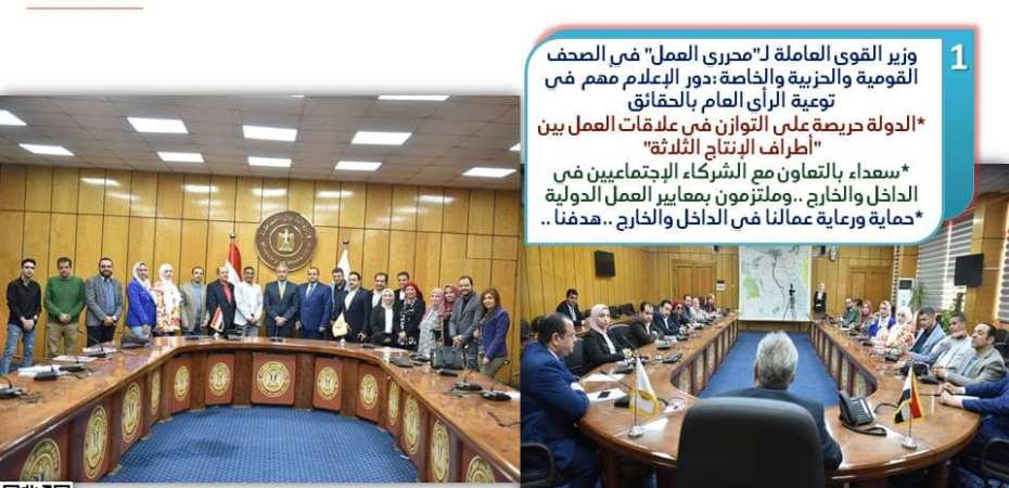 أكد وزير القوى العاملة حسن شحاتة على أهمية دور الإعلام في توعية الرأي العام بالحقائق،بما تقوم به الدولة خاصة في ملف العمل،وقال “الوزير” لـ”محررى العمل” من صحف ومواقع قومية وحزبية وخاصة،إلتقى بهم بديوان عام “الوزارة”،أن الدولة المصرية حريصة على الإستمرار في تحقيق التوازن في علاقات العمل بين أطراف الإنتاج الثلاثة من “حكومة وأصحاب أعمال وعمال “،وأن كافة التشريعات والقرارات التي تخص قضايا العمل ،تتضمن تلك المبادئ القائمة على الحقوق والواجبات لكافة الأطراف،بهدف تعزيز علاقات العمل ،وخلق بيئة لائقة ،تستفيد منها العملية الإنتاجية في “الجمهورية الجديدة”،موضحاً أن الدولة حريصة على حماية ورعاية عمالها في الداخل والخارج ،مستشهداً بحزمة القرارات والتوجيهات الرئاسية بشأن زيادة الأجور والمعاشات وتوفير حياة كريمة لكافة المواطنيين ،ودعم العمالة غير المنتظمة ،ودمج ذوي الهمم في سوق العمل من خلال سياسة “الوزارة” بالحصر والتدريب والتشغيل،وكذلك تدريب وتأهيل الشباب على مِهن يحتاجها سوق العمل الداخلي والخارجي في ظل التحديات العالمية الراهنة التي تواجه “سوق العمل العالمي”.