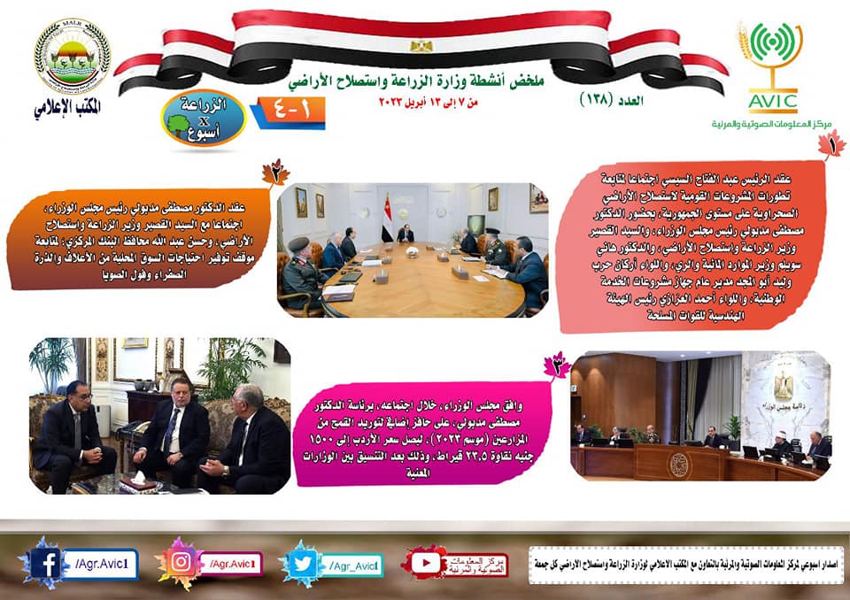 أصدر مركز المعلومات الصوتية والمرئية، التابع لوزارة الزراعة واستصلاح الاراضي، “الانفوجراف الأسبوعي” في نسخته رقم ١٣٨ ، حول الحصاد الأسبوعي لأهم أنشطة الوزارة، خلال الأسبوع الماضي في الفترة من ٧ وحتى ١٣ أبريل الجاري، وذلك بالتعاون مع المكتب الإعلامي للوزارة، كما أصدر المركز أيضا ملخصا بالفيديو، حول أنشطة الوزارة خلال نفس الفترة.