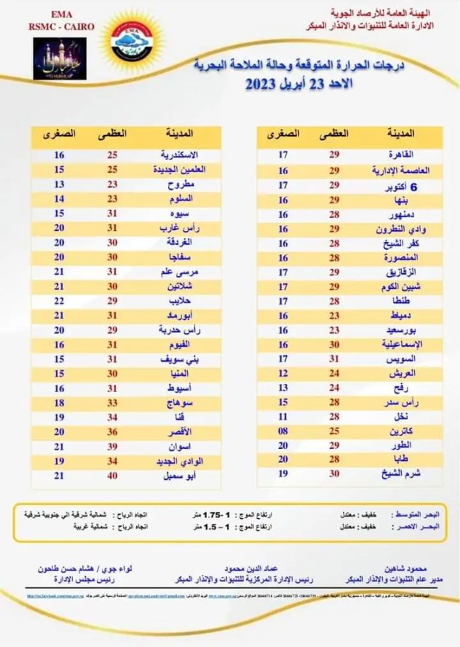 وأضافت أن الطقس سيكون مائل للحرارة نهاراً على القاهرة الكبرى والوجه البحري، مائل للدفء على السواحل الشمالية، حار على جنوب سيناء وشمال الصعيد شديد الحرارة على جنوب الصعيد، مائل للبرودة ليلا على أغلب الأنحاء.