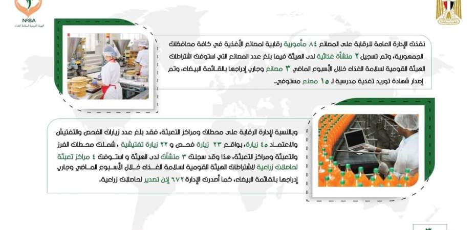 نفذت الإدارة العامة للرقابة على المصانع 84 مأمورية رقابية لمصانع الأغذية في كافة محافظات الجمهورية، وتم تسجيل 2 منشأة غذائية لدى الهيئة فيما بلغ عدد المصانع التي استوفت اشتراطات الهيئة القومية لسلامة الغذاء خلال الأسبوع الماضي 3 مصانع وجاري إدراجها بالقائمة البيضاء، وتم إصدار شهادة توريد تغذية مدرسية لـ 15 مصنع مستوفي.
