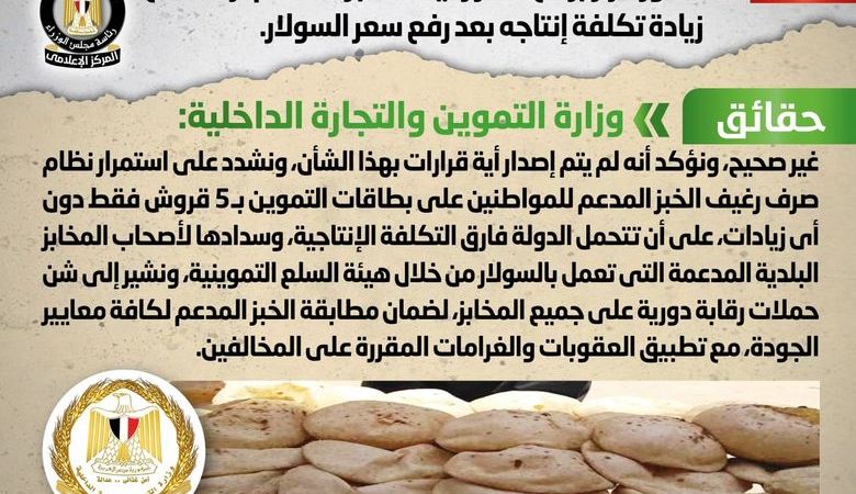 انتشر في بعض المواقع الإلكترونية وصفحات التواصل الاجتماعي أنباء بشأن صدور قرار برفع سعر رغيف الخبز المدعم تزامناً مع زيادة تكلفة إنتاجه بعد رفع سعر السولار، وقد قام المركز الإعلامي لمجلس الوزراء بالتواصل مع وزارة التموين والتجارة الداخلية، والتي نفت تلك الأنباء، مُؤكدةً أنه لا صحة لرفع سعر رغيف الخبز المدعم تزامناً مع زيادة تكلفة إنتاجه بعد رفع سعر السولار، وأنه لم يتم إصدار أية قرارات بهذا الشأن، مُشددةً على استمرار نظام صرف رغيف الخبز المدعم للمواطنين على بطاقات التموين بـ 5 قروش فقط دون أي زيادات، على أن تتحمل الدولة فارق التكلفة الإنتاجية، وسدادها لأصحاب المخابز البلدية المدعمة التي تعمل بالسولار من خلال هيئة السلع التموينية، مُشيرةً إلى شن حملات رقابة دورية على جميع المخابز، لضمان مطابقة الخبز المدعم لكافة معايير الجودة، مع تطبيق العقوبات والغرامات المقررة على المخالفين.