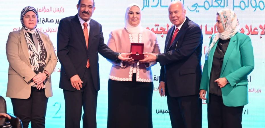 وزيرة التضامن الاجتماعي خلال مشاركتها في المؤتمر العلمي السادس للمعهد الدولي العالي للإعلام بعنوان “الإعلام وقضايا العنف المجتمعي” بحضور قادة الرأي وكبار الإعلاميين:
