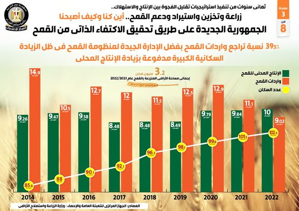 وأبرز التقرير تراجع واردات القمح بنسبة 39.5% بفضل الإدارة الجيدة لمنظومة القمح في ظل الزيادة السكانية الكبيرة مدفوعة بزيادة الإنتاج المحلي، مشيراً إلى أن حجم الإنتاج المحلي من القمح في عام 2022 بلغ 10 ملايين طن، في حين بلغت الواردات 9.02 مليون طن، مع بلوغ عدد السكان 102.9 مليون نسمة.