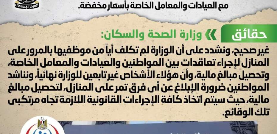 انتشر في بعض وسائل الإعلام والمواقع الإلكترونية وصفحات التواصل الاجتماعي أنباء بشأن توجيه وزارة الصحة فرقاً طبية للمرور على المنازل لتحصيل مبالغ مالية من المواطنين مقابل إجراء تعاقدات مع العيادات والمعامل الخاصة بأسعار مخفضة، وقد قام المركز الإعلامي لمجلس الوزراء بالتواصل مع وزارة الصحة والسكان، والتي نفت تلك الأنباء، مُؤكدةً أنه لا صحة لتوجيه الوزارة أي فرق طبية للمرور على المنازل لتحصيل مبالغ مالية من المواطنين، مُشددةً على أن الوزارة لم تكلف أياً من موظفيها بالمرور على المنازل لإجراء تعاقدات بين المواطنين والعيادات والمعامل الخاصة، وتحصيل مبالغ مالية، وأن هؤلاء الأشخاص غير تابعين للوزارة نهائياً، مُناشدةً المواطنين ضرورة الإبلاغ عن أي فرق تمر على المنازل، لتحصيل مبالغ مالية، حيث سيتم اتخاذ كافة الإجراءات القانونية اللازمة تجاه مرتكبي تلك الوقائع.