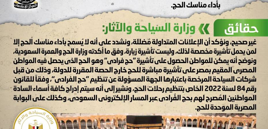 وقد قام المركز الإعلامي لمجلس الوزراء بالتواصل مع وزارة السياحة والآثار، والتي نفت تلك الأنباء، مُؤكدةً أنه لا صحة للسماح لحاملي تأشيرة الزيارة للمملكة العربية السعودية بكل أنواعها بأداء مناسك الحج، وأن الإعلانات المتداولة مُضللة، مُشددةً على أنه لا يُسمح بأداء مناسك الحج إلا لمن يحمل تأشيرة مخصصة لذلك، وليست تأشيرة زيارة، وفق ما أكدته وزارة الحج والعمرة السعودية، مُوضحةً أنه يمكن للمواطن الحصول على تأشيرة “حج فرادى” وهو الحج الذي يحصل فيه المواطن المصري المقيم بمصر على تأشيرة مباشرة للحج خارج الحصة المقررة للدولة،