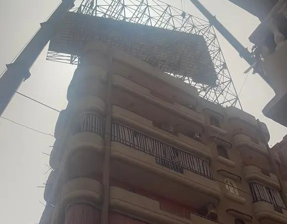 وفور إبلاغ محافظة القاهرة لغرفة الطوارىء الدائمة بشركة المقاولون العرب وطلب التدخل لإنقاذ الموقف تحركت على الفور معدات وأوناش الشركة والتى تمثلت فى إثنين ونش بحمولة ١٦٠ طن و مجموعة من الفنيين المتخصصين حيث تم التحكم فى اللوحة الضخمة وإنقاذها من السقوط على العمارات الملاصقة لها، وبدأت أطقم العاملين فى تقطيع اللوحة إلى أجزاء للسيطرة عليها و تم تنزيلها بسلام إلى الأرض.