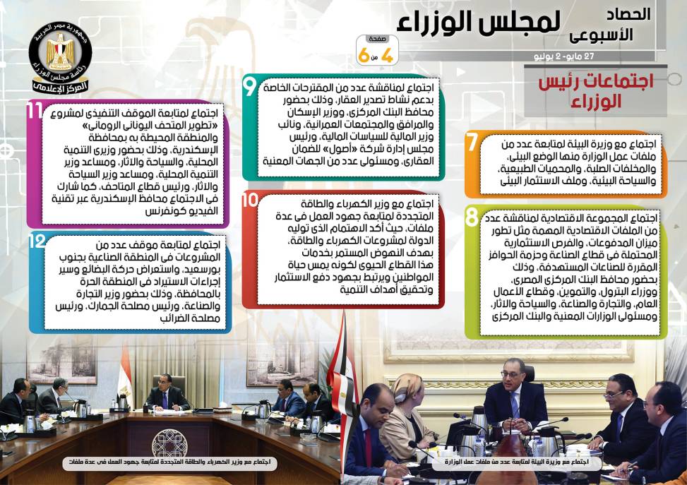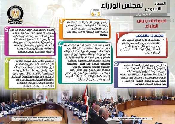 نشر المركز الإعلامي لمجلس الوزراء، تقريراً شمل إنفوجرافات سلط من خلالها الضوء على الحصاد الأسبوعي لمجلس الوزراء، وذلك خلال الفترة من 27مايو حتى 2 يونيو 2023، والذي تضمن الموافقة على عدد من القرارات، فضلاً عن الاجتماعات واللقاءات التي عقدها الدكتور مصطفى مدبولي، رئيس مجلس الوزراء، بالإضافة إلى ما قام به سيادته من أنشطة.