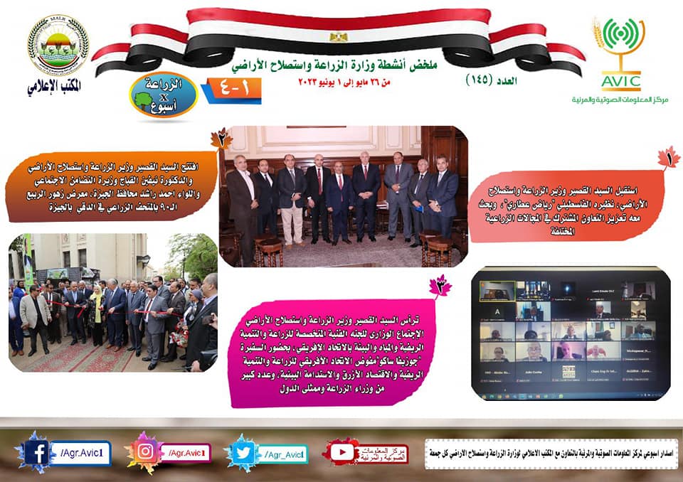 أصدر مركز المعلومات الصوتية والمرئية، التابع لوزارة الزراعة واستصلاح الأراضي، “الانفوجراف الأسبوعي” في نسخته رقم ١٤٥ ، حول الحصاد الأسبوعي لأهم أنشطة الوزارة، خلال الأسبوع الماضي في الفترة من ٢٦ مايو وحتى ١ يونيو الجاري، وذلك بالتعاون مع المكتب الإعلامي للوزارة، كما أصدر المركز أيضا ملخصا بالفيديو، حول أنشطة الوزارة خلال نفس الفترة.