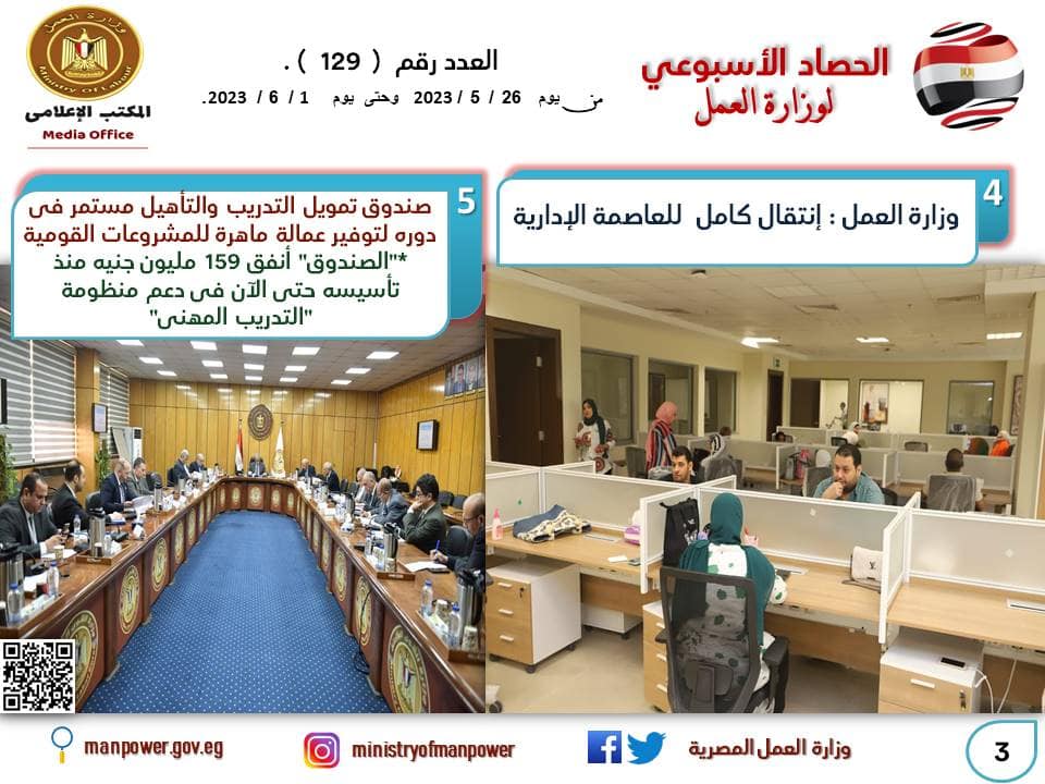 أصدرت وزارة العمل تقريراً بشأن حصاد الـ7 أيام الماضية،والتي شهدت مجموعة من الأنشطة،والقرارات ،والأحداث ومن بينها الإنتقال الكامل إلى العاصمة الإدارية الجديدة ،وصدور قرار بشأن تغيير إسم “الوزارة” من “القوى العاملة” إلى “العمل” ،فضلاً عن إجتماع تنسيقي للتحضير للمشاركة في فعاليات الدورة 111 لمؤتمر العمل الدولي بجنيف ،ضمن 187 دولة حول العالم ،كما إستمرت “الوزارة” في نشاطها بتوفير فرص العمل ،وتنظيم ملتقيات التوظيف في المحافظات تنسيقاً مع القطاع الخاص ،كما شهد ديوان عام الوزارة إجتماعاً لمجلس إدارة صندوق تمويل التدريب والتأهيل ،معلناً عن أرقامِ جديدة تؤكد دور “الوزارة” في دعم ملف التدريب المهني ،وتأهيل الشباب على مهن يحتاجها سوق العمل..كما شهد “الديوان” تقديم دعم جديد لعمالة غير منتظمة تنفيذاً لتوجيهات الرئيس عبدالفتاح السيسي رئيس الجمهورية ..وكذلك تستمر مكاتب التمثيل العمالي في الخارج في دورها برعاية وحماية عمالنا ،وتوعيتهم بحقوقهم وواجباتهم ،فعادت مستحقات عمال مصريين من الأردن والسعودية ،كما تواصل مديريات العمل بالمحافظات دورها في تعزيز علاقات العمل بين صاحب العمل والعامل في المنشأت الصناعية لزيادة الإنتاج ،وللإستقرار في مواقع العمل ..إلى التفاصيل ..