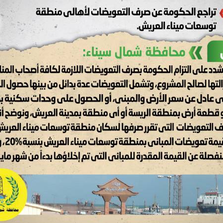 الحكومة تنفى التراجع عن صرف التعويضات لأهالي منطقة توسعات ميناء العريش