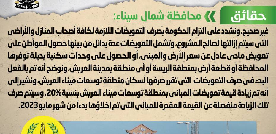 انتشر في بعض المواقع الإلكترونية وصفحات التواصل الاجتماعي أنباء بشأن تراجع الحكومة عن صرف التعويضات لأهالي منطقة توسعات ميناء العريش، وقد قام المركز الإعلامي لمجلس الوزراء بالتواصل مع محافظة شمال سيناء، والتي نفت تلك الأنباء، مُؤكدةً أنه لا صحة للتراجع عن صرف التعويضات لأهالي منطقة توسعات ميناء العريش، مُشددةً على التزام الحكومة بصرف التعويضات اللازمة لكافة أصحاب المنازل والأراضي التي سيتم إزالتها لصالح المشروع، وتشمل التعويضات عدة بدائل من بينها حصول المواطن على تعويض مادي عادل عن سعر الأرض والمبنى، أو الحصول على وحدات سكنية بديلة توفرها المحافظة أو قطعة أرض بمنطقة الريسة أو أي منطقة بمدينة العريش، مُوضحةً أنه تم بالفعل البدء في صرف التعويضات التي تقرر صرفها لسكان منطقة توسعات ميناء العريش، مُشيرةً إلى أنه تم زيادة قيمة تعويضات المباني بمنطقة توسعات ميناء العريش بنسبة 20%، وسيتم صرف تلك الزيادة منفصلة عن القيمة المقدرة للمباني التي تم إخلاؤها بدءاً من شهر مايو 2023.