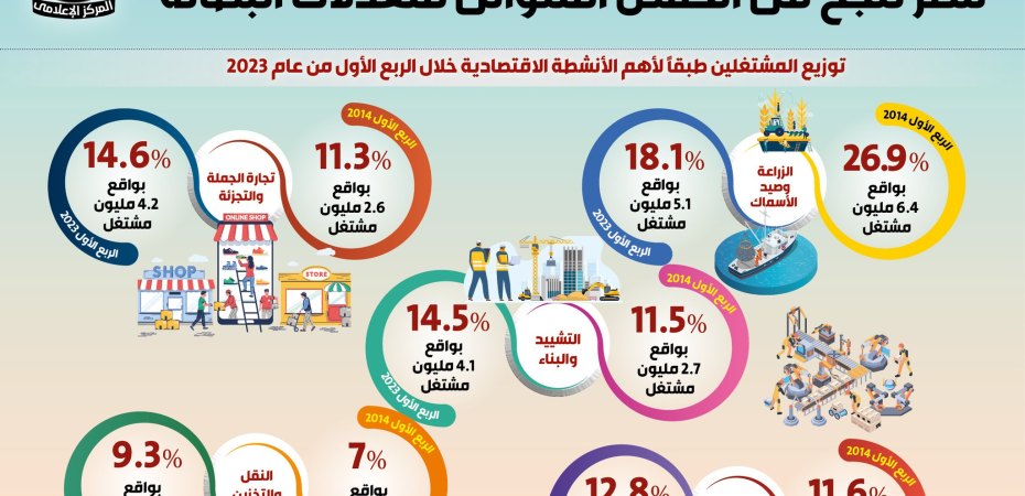 وفيما يتعلق بتوزيع المشتغلين طبقاً لأهم الأنشطة الاقتصادية خلال الربع الأول من عام 2023 مقارنة بالربع نفسه من عام 2014، ذكر التقرير أن الزراعة وصيد الأسماك شملت 18.1% بواقع 5.1 مليون مشتغل في الربع الأول من عام 2023 مقارنة بـ 26.9% بواقع 6.4 مليون مشتغل في الربع ذاته من عام 2014، فضلاً عن تجارة الجملة والتجزئة بنسبة 14.6% بواقع 4.2 مليون مشتغل في الربع الأول من عام 2023 مقارنة بـ 11.3% بواقع 2.6 مليون مشتغل في الربع نفسه من عام 2014.