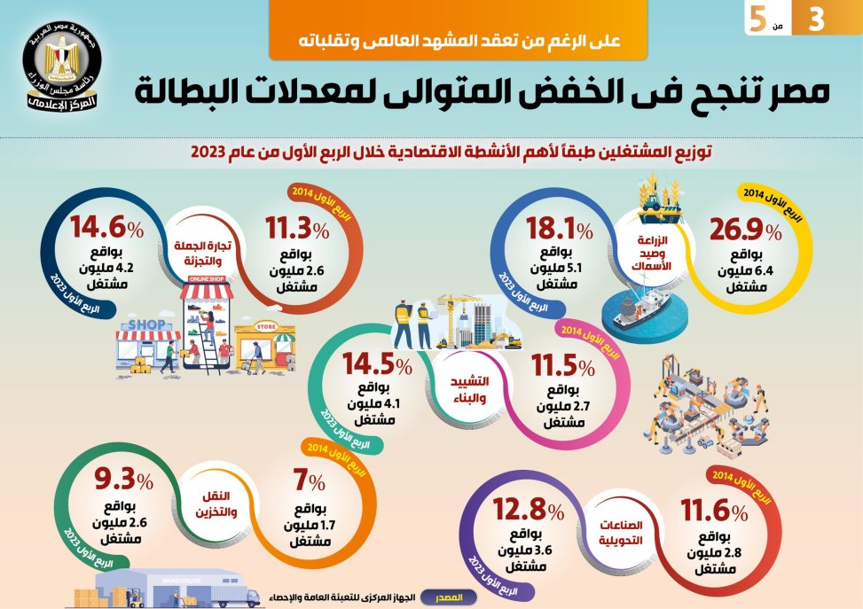 وفي هذا الصدد نشر المركز الإعلامي لمجلس الوزراء تقريراً تضمن إنفوجرافات تسلط الضوء على نجاح مصر في الخفض المتوالي لمعدلات البطالة رغم تعقد المشهد العالمي وتقلباته.