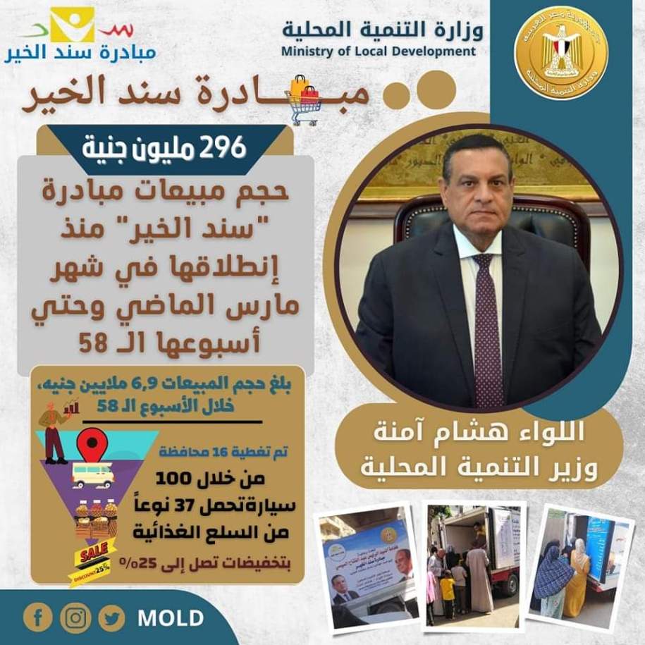 جاء ذلك خلال التقرير الذي تلقاه اللواء هشام آمنة، عن متابعة نتائج مبادرة «سند الخير» منذ إنطلاقها في مارس ٢٠٢٢ وحتى نهاية الأسبوع الحالي، وهو الأسبوع رقم 58 من المبادرة، حيث نجحت المبادرة في تحقيق مبيعات تقدر بحوالي ٢٩٦ مليون جنيه، مشيرا إلى أن المبادرة تستهدف توفير السلع الغذائية واللحوم والدواجن والأسماك في الأحياء الشعبية والقرى في (18) محافظة كمرحلة أولى وهى محافظات (المنيا – أسيوط – سوهاج – قنا – الأقصر – أسوان- كفر الشيخ– الدقهلية-الإسماعيلية- السويس- البحيرة- القاهرة- الجيزة- جنوب سيناء- الفيوم- بنى سويف – الغربية- شمال سيناء).