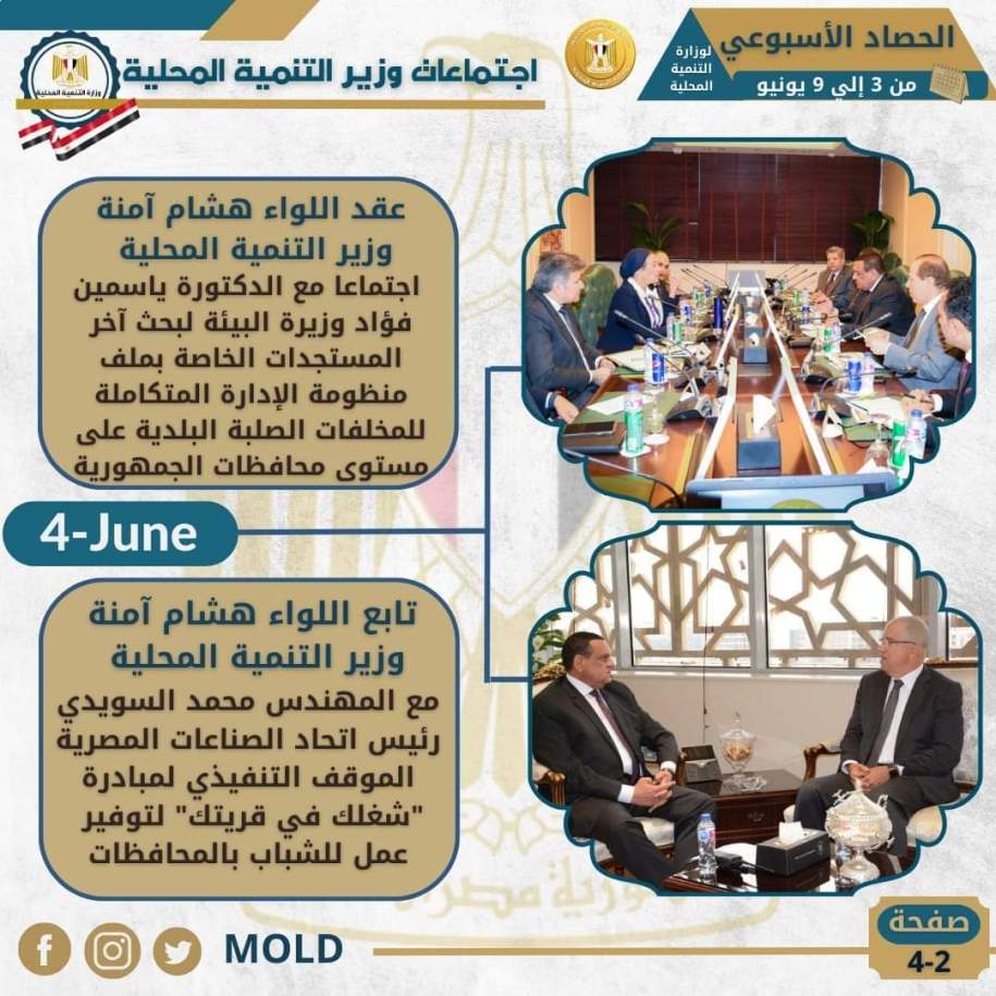 أصدر المركز الإعلامي، التابع لوزارة التنمية المحلية، “الانفوجراف الأسبوعي” في نسخته الـ ٣٨ حول حصاد أهم الأنشطة والفعاليات التي قام بها اللواء هشام آمنة وزير التنمية المحلية، خلال الأسبوع الماضي في الفترة من ٣ حتي ٩ يونيو الجاري، حيث نستعرض أبرزها في التقرير التالي الذي نشرته الصفحة الرسمية لوزارة التنمية المحلية على موقع التواصل الاجتماعي “فيس بوك” من خلال انفوجراف يرصد أبرز تلك الأنشطة التي جاءت كالتالي: