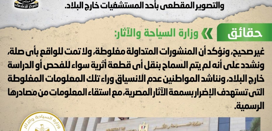 تداولت بعض المواقع الإلكترونية وصفحات التواصل الاجتماعي منشورات تزعم نقل قطع أثرية من أحد المتاحف المصرية للفحص والتصوير المقطعي بأحد المستشفيات خارج البلاد، وقد قام المركز الإعلامي لمجلس الوزراء بالتواصل مع وزارة السياحة والآثار، والتي نفت تلك الأنباء، مُؤكدةً أنه لا صحة لنقل قطع أثرية من أحد المتاحف المصرية للفحص والتصوير المقطعي بأحد المستشفيات خارج البلاد، وأن المنشورات المتداولة مغلوطة، ولا تمت للواقع بأي صلة، مُشددةً على أنه لم يتم السماح بنقل أي قطعة أثرية سواء للفحص أو الدراسة خارج البلاد، مُناشدةً المواطنين عدم الانسياق وراء تلك المعلومات المغلوطة التي تستهدف الإضرار بسمعة الآثار المصرية، مع استقاء المعلومات من مصادرها الرسمية.