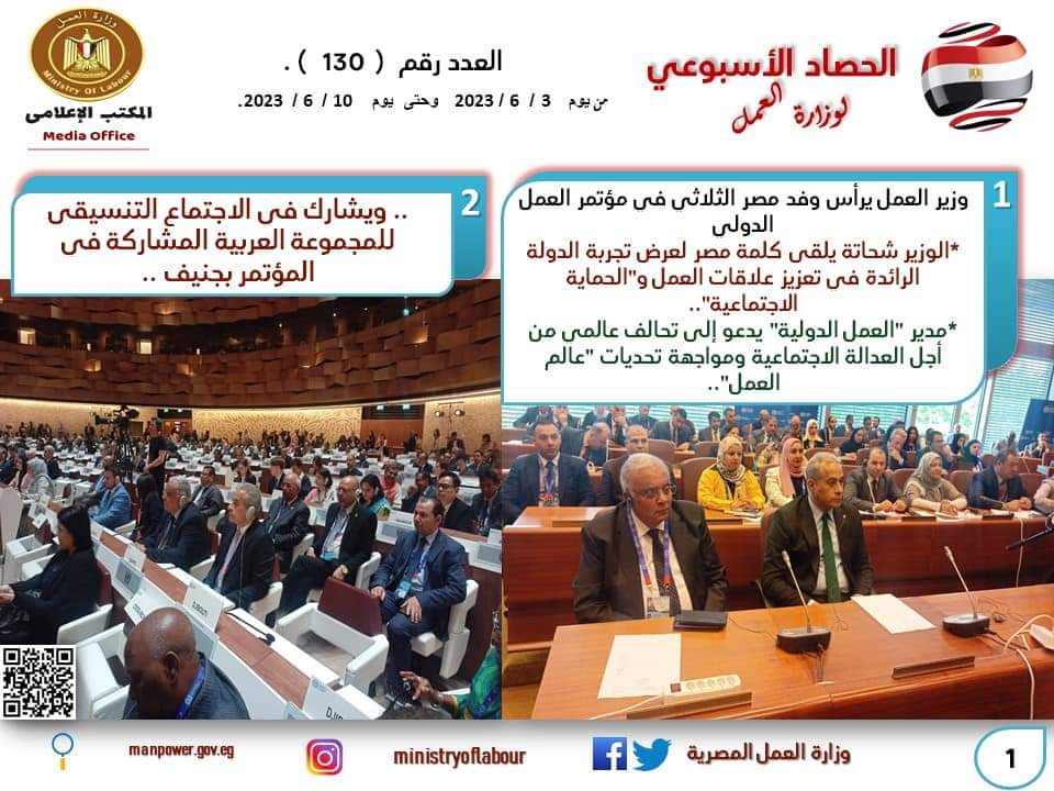 أصدرت وزارة العمل اليوم الأحد تقريراً و”إنفوجراف” بشأن مشاركة وفد عمل مصر خلال الـ7 أيام الماضية في فعاليات الدورة 111 لمؤتمر العمل الدولي المنعقد في جنيف بحضور 5000 مندوب ،يمثلون أطراف العمل الثلاثة من حكومات وأصحاب أعمال وعمال ،من 187 دولة حول العالم ،والمنعقدة خلال الفترة من 5 وحتى 16 يونيه الجاري ،لمناقشة تقرير المدير العام لمنظمة العمل الدولية جيلبرن هنغبو بشأن “النهوض بالعدالة الإجتماعية” ،وملفات أخرى خاصة بالتحديات التي تواجه عالم العمل حول العالم ،وأيضا ملف العمل في الأراضي العربية المُحتلة ،وأهمية تشكيل تحالف عالمي لمواجهة تلك التحديات ..الوزير حسن شحاتة وزير العمل الذي يرأس وفد مصر الثلاثي “حكومة وأصحاب أعمال وعمال”، في هذا المؤتمر الذي تنظمه منظمة العمل الدولية التابعة للأمم المتحدة ،إلتقى بعدد من نظرائه العرب والدوليين ،والافارقة ،وكذلك مع المدير العام لمنظمة العمل الدولية ،والمدير العام لمنظمة الهجرة الدولية ،وألقى كلمة في الجلسة العامة رصد خلالها سياسات الدولة المصرية في مجال العمل ،وأيضا برامج الحماية الإجتماعية التي قللت من تأثير التحديات العالمية على سوق العمل المصري،مؤكداً على أن مشروعات مصر العملاقة وتوفير فرص العمل ،وحماية العمالة غير المنتظمة