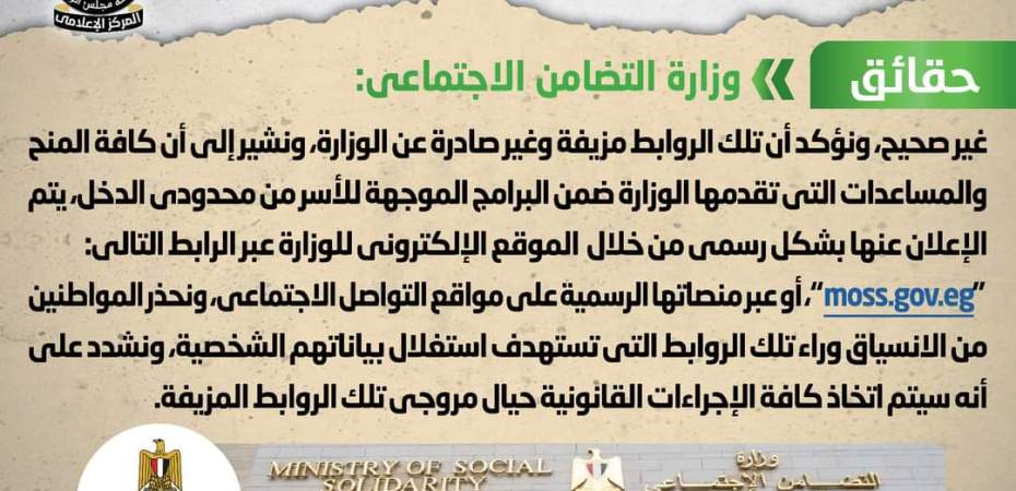 تداولت بعض مواقع التواصل الاجتماعي وجروبات تطبيق “الواتس اب” روابط إلكترونية منسوبة لوزارة التضامن تزعم صرف إعانات نقدية بقيمة 8500 جنيه لكل مواطن، وقد قام المركز الإعلامي لمجلس الوزراء بالتواصل مع وزارة التضامن الاجتماعي، والتي نفت تلك الأنباء مُؤكدةً أنه لا صحة لصرف إعانات نقدية بقيمة 8500 جنيه لكل مواطن، وأن تلك الروابط مزيفة، وغير صادرة عن الوزارة، مُشيرةً إلى أن كافة المنح والمساعدات التي تقدمها الوزارة ضمن البرامج الموجهة للأسر من محدودي الدخل، يتم الإعلان عنها بشكل رسمي من خلال الموقع الإلكتروني للوزارة عبر الرابط التالي: “moss.gov.eg”، أو عبر منصاتها الرسمية على مواقع التواصل الاجتماعي، مُحذرةً المواطنين من الانسياق وراء تلك الروابط التي تستهدف استغلال بياناتهم الشخصية، مُشددةً على أنه سيتم اتخاذ كافة الإجراءات القانونية حيال مروجي تلك الروابط المزيفة.