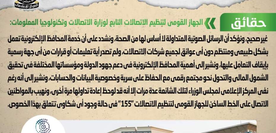 تداول رسائل صوتية على تطبيق “واتس آب” تزعم صدور قرار بوقف خدمة المحافظ الإلكترونية الخاصة بشركات الاتصالات إلى أجل غير مسمى، وقد قام المركز الإعلامي لمجلس الوزراء بالتواصل مع الجهاز القومي لتنظيم الاتصالات التابع لوزارة الاتصالات وتكنولوجيا المعلومات، والذي نفى تلك الأنباء، مُؤكداً أنه لا صحة لوقف خدمة المحافظ الإلكترونية الخاصة بشركات الاتصالات إلى أجل غير مسمى، وأن الرسائل الصوتية المتداولة لا أساس لها من الصحة، مُشدداً على أن خدمة المحافظ الإلكترونية تعمل بشكل طبيعي ومنتظم دون أي عوائق لجميع شركات الاتصالات، ولم تصدر أية تعليمات أو قرارات من أي جهة رسمية بإيقاف التعامل عليها، مشيراً إلى أهمية المحافظ الإلكترونية في دعم جهود الدولة ومؤسساتها المختلفة في تحقيق الشمول المالي والتحول نحو مجتمع رقمي مع الحفاظ على سرية وخصوصية البيانات والحسابات، مُشيراً إلى أنه رغم نفي المركز الإعلامي لمجلس الوزراء لتلك الشائعة عدة مرات إلا أنه قد لوحظ إعادة تداولها مرة أخرى، مُهيباً بالمواطنين الاتصال على الخط الساخن للجهاز القومي لتنظيم الاتصالات “155” في حالة وجود أي شكاوى تتعلق بهذا الخصوص.