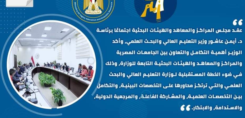 4) عقد مجلس المراكز والمعاهد والهيئات البحثية اجتماعًا برئاسة د. أيمن عاشور وزير التعليم العالي والبحث العلمي، وأكد الوزير أهمية التكامل والتعاون بين الجامعات المصرية والمراكز والمعاهد والهيئات البحثية التابعة للوزارة، وذلك في ضوء الخطة المستقبلية لوزارة التعليم العالي والبحث العلمي والتي ترتكز محاورها على التخصصات البينية، والتكامل بين التخصصات العلمية، والمشاركة الفاعلة، والمرجعية الدولية، والاستدامة، والابتكار.