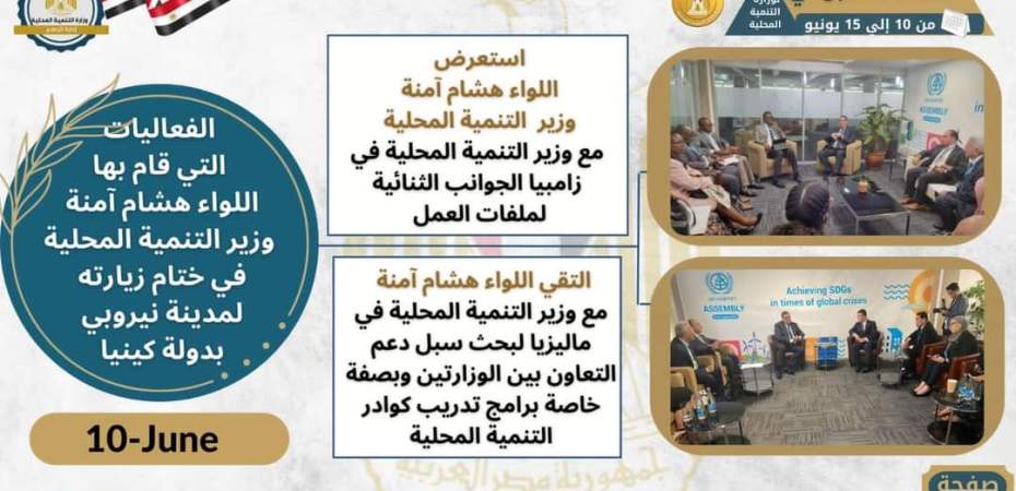 كما اختتم وزير التنمية المحلية ، زيارته إلي مدينة نيروبي بدولة كينيا بعد المشاركة فى فعاليات الدورة الثانية، لجمعية برنامج الأمم المتحدة للمستوطنات البشرية الهابيتات ” UN-HABITAT ” والتي عقدت خلال الفترة من الفترة من 5 الي 9 يونيو الجاري، بلقاءه مع عدد من وزراء التنمية المحلية المشاركين فى أعمال الدورة الثانية لجمعية “الهابيتات” وعلى رأسهم وزير التنمية المحلية الماليزي الذى تباحث مع ” آمنة ” سبل دعم التعاون بين الوزارتين وبصفة خاصة برامج تدريب كوادر التنمية المحلية وتبادل الخبرات والمعارف والنظر خلال الفترة المقبلة في التوقيع على مذكرة تفاهم مشتركة تضم كافة جوانب علاقات التعاون الثنائى وتؤسس لعلاقات وطيدة بين البلدين خاصة في ظل التجارب التنموية الهامة التي شهدتها مصر وماليزيا على المستويات المحلية والتي يمكن تبادلها والاستفادة منها بالإضافة إلى التجربة الماليزية في مجالات الصناعات الصغيرة والمتوسطة وبعض ملفات العمل الآخرى التي تهم المواطنين .