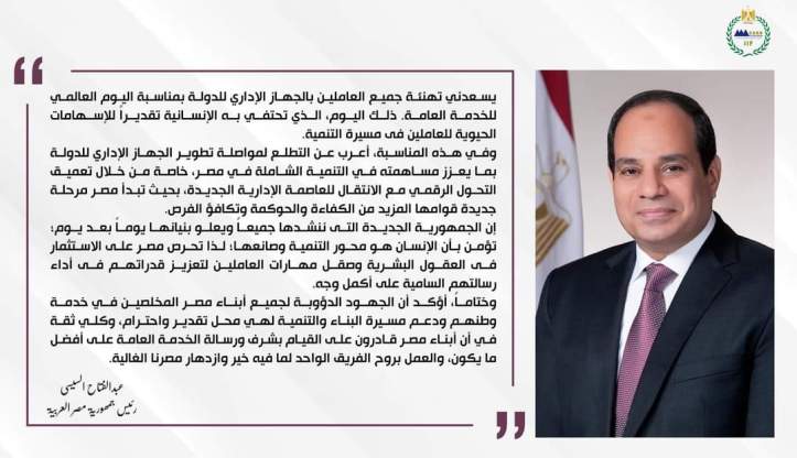 “يسعدني تهنئة جميع العاملين بالجهاز الإداري للدولة بمناسبة اليوم العالمي للخدمة العامة. ذلك اليوم، الذي تحتفي به الإنسانية تقديراً للإسهامات الحيوية للعاملين فى مسيرة التنمية.