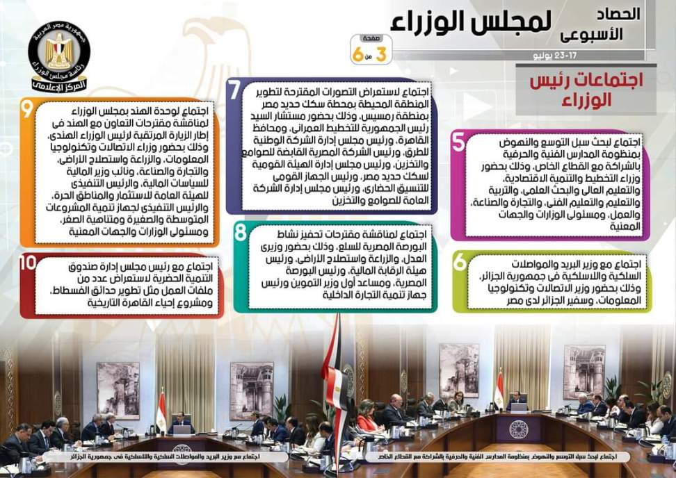 نشر المركز الإعلامي لمجلس الوزراء، تقريراً شمل إنفوجرافات سلط من خلالها الضوء على الحصاد الأسبوعي لمجلس الوزراء، وذلك خلال الفترة من 17 حتى 23 يونيو 2023، والذي تضمن الموافقة على عدد من القرارات، فضلاً عن الاجتماعات واللقاءات التي عقدها الدكتور مصطفى مدبولي، رئيس مجلس الوزراء، بالإضافة إلى ما قام به سيادته من أنشطة.