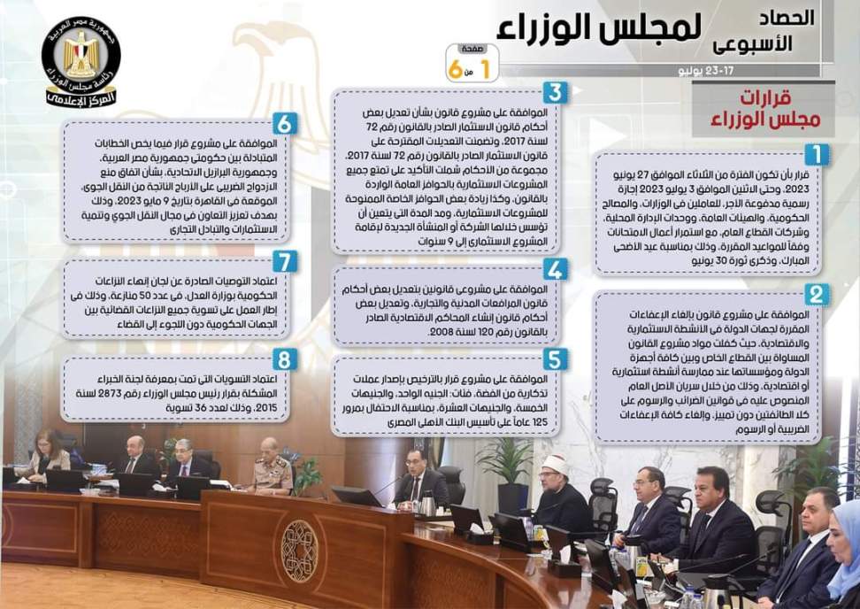 وجاء في التقرير أنه تم إصدار عدد من القرارات وتشمل قراراً بأن تكون الفترة من الثلاثاء الموافق 27 يونيو 2023، وحتى الاثنين الموافق 3 يوليو 2023 إجازة رسمية مدفوعة الأجر، للعاملين في الوزارات، والمصالح الحكومية، والهيئات العامة، ووحدات الإدارة المحلية، وشركات القطاع العام، مع استمرار أعمال الامتحانات وفقاً للمواعيد المقررة، وذلك بمناسبة عيد الأضحى المبارك، وذكرى ثورة 30 يونيو، فضلاً عن الموافقة على مشروع قانون بإلغاء الإعفاءات المقررة لجهات الدولة في الأنشطة الاستثمارية والاقتصادية، حيث كفلت مواد مشروع القانون المساواة بين القطاع الخاص وبين كافة أجهزة الدولة ومؤسساتها عند ممارسة أنشطة استثمارية أو اقتصادية، وذلك من خلال سريان الأصل العام المنصوص عليه في قوانين الضرائب والرسوم على كلا الطائفتين دون تمييز، وإلغاء كافة الإعفاءات الضريبية أو الرسوم، بالإضافة إلى الموافقة على مشروع قانون بشأن تعديل بعض أحكام قانون الاستثمار الصادر بالقانون رقم 72 لسنة 2017، وتضمنت التعديلات المقترحة على قانون الاستثمار الصادر بالقانون رقم 72 لسنة 2017، مجموعة من الأحكام شملت التأكيد على تمتع جميع المشروعات الاستثمارية بالحوافز العامة الواردة بالقانون، وكذا زيادة بعض الحوافز الخاصة الممنوحة للمشروعات الاستثمارية، ومد المدة التي يتعين أن تؤسس خلالها الشركة أو المنشأة الجديدة لإقامة المشروع الاستثمارى إلى 9 سنوات، وكذلك الموافقة على مشروعي قانونين بتعديل بعض أحكام قانون المرافعات المدنية والتجارية، وتعديل بعض أحكام قانون إنشاء المحاكم الاقتصادية الصادر بالقانون رقم 120 لسنة 2008.