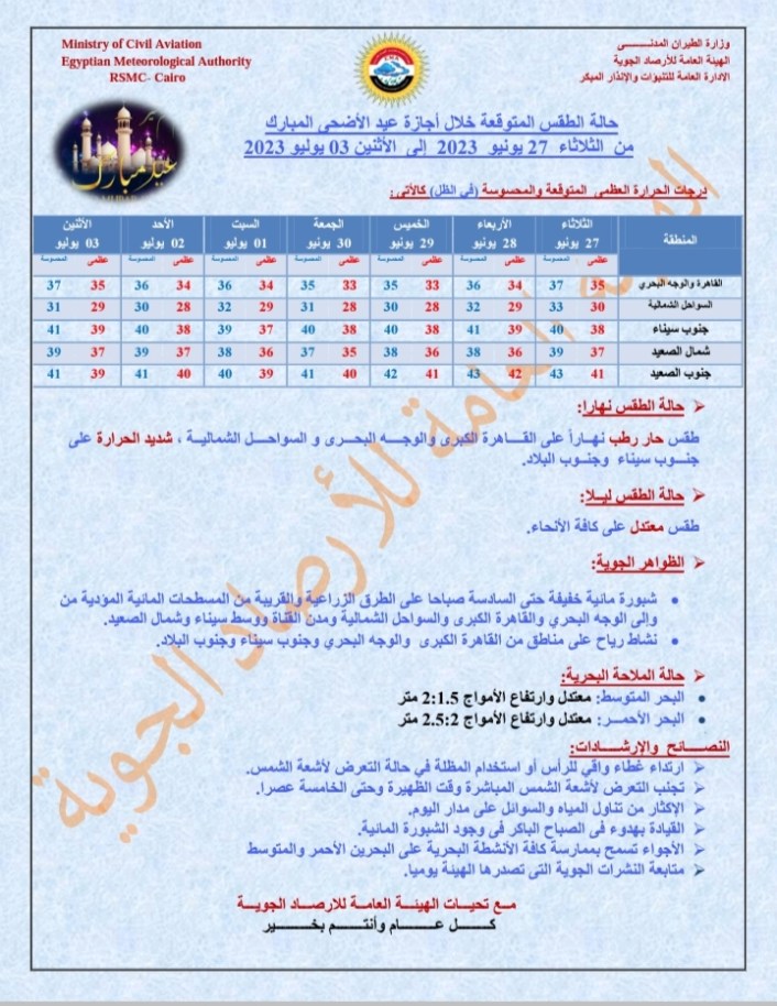 كشفت الهيئة العامة للأرصاد الجوية عن حالة الطقس المتوقعة ودرجات الحرارة خلال إجازة عيد الأضحى المبارك خلال الفترة من الثلاثاء 27 يونيو وحتى الإثنين 3 يوليو.