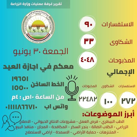 و تستقبل وزارة الزراعة واستصلاح الأراضي، شكاوى واستفسارات المواطنين على ارقام الخط الساخن : ١٥٥٠٠ ، و ١٩٥٦١، من الساعه ١٠ صباحا وحتى ٤ مساءا، فضلا عن استقبال الشكاوى والاستفسارات من خلال رقم واتس اب ٠١١١١٨٦٦٧١٠.