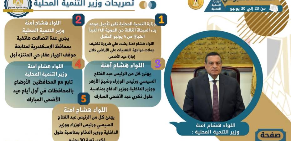أصدر المركز الإعلامي التابع لوزارة التنمية المحلية، ” الانفوجراف الأسبوعي” في نسخته الـ ٤٢ حول حصاد أهم الأنشطة والفعاليات التي قام بها اللواء هشام آمنة وزير التنمية المحلية، خلال الأسبوع الماضي في الفترة من ٢٣ حتي ٣٠ يونيو الجاري، حيث نستعرض أبرزها في التقرير التالي الذي نشرته الصفحة الرسمية لوزارة التنمية المحلية على موقع التواصل الاجتماعي “فيس بوك” من خلال انفوجراف يرصد أبرز تلك الأنشطة التي جاءت كالتالي: