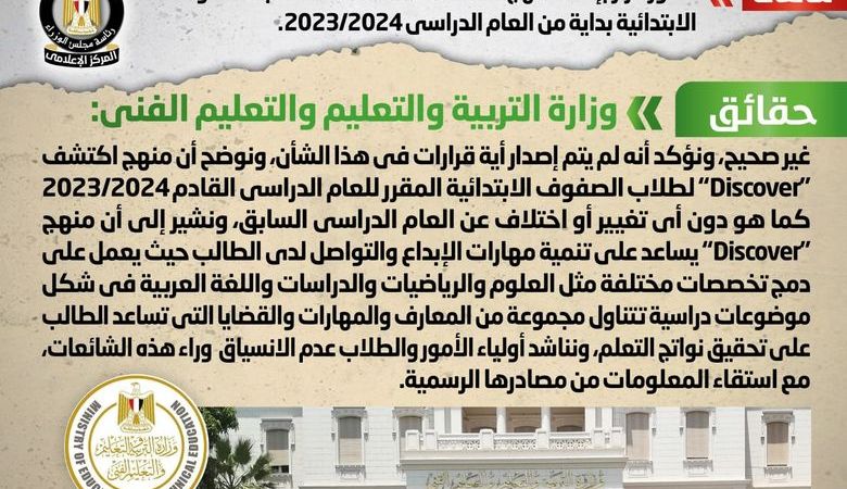 انتشر في بعض المواقع الإلكترونية وصفحات التواصل الاجتماعي أنباء بشأن صدور قرار بإلغاء منهج اكتشف “Discover” لطلاب الصفوف الابتدائية بداية من العام الدراسي 2023/2024، وقد قام المركز الإعلامي لمجلس الوزراء بالتواصل مع وزارة التربية والتعليم والتعليم الفني، والتي نفت تلك الأنباء، مُؤكدةً أنه لا صحة لصدور قرار بإلغاء منهج اكتشف “Discover” لطلاب الصفوف الابتدائية بداية من العام الدراسي 2023/2024،