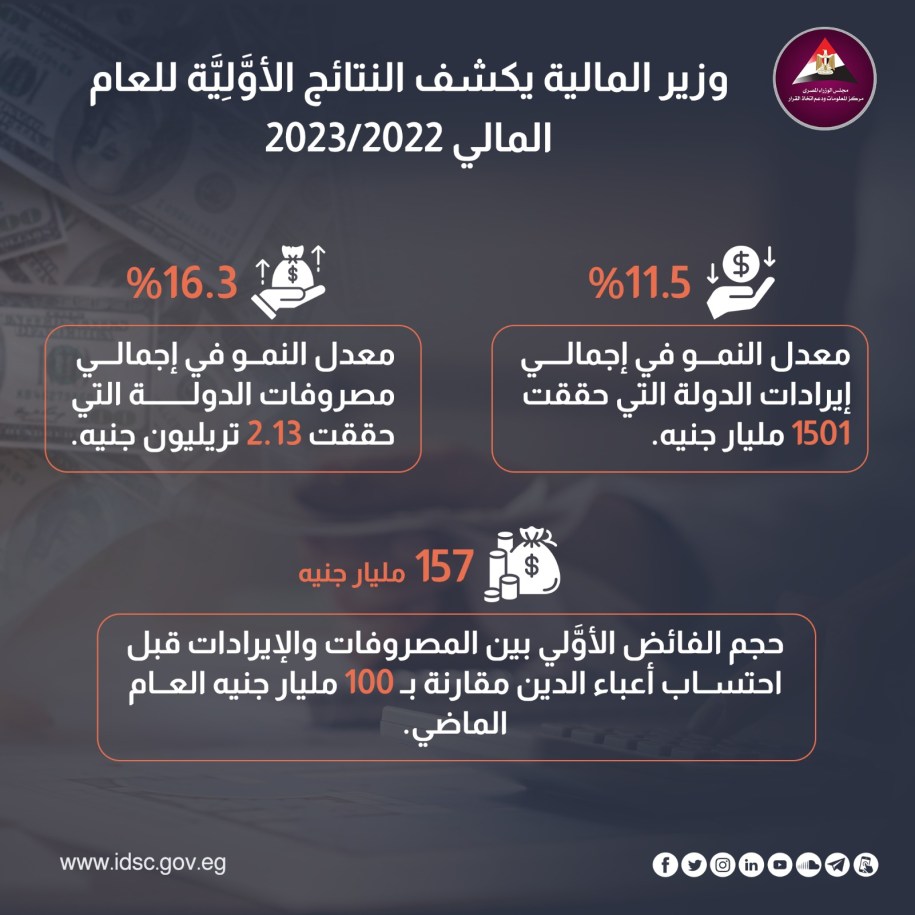 نشر مركز المعلومات ودعم اتخاذ القرار بمجلس الوزراء، اليوم الأربعاء، على صفحته الرسمية عبر أحد مواقع التواصل الاجتماعي “فيس بوك”، إنفوجرافين جديدين يسلطان الضوء على النتائج الأولية للسنة المالية 2022-2023.