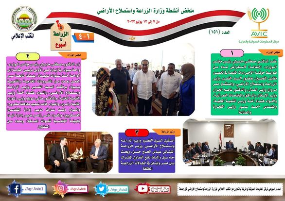 أصدر مركز المعلومات الصوتية والمرئية، التابع لوزارة الزراعة واستصلاح الأراضي، “الانفوجراف الأسبوعي” في نسخته رقم ١٥١ ، حول الحصاد الأسبوعي لأهم أنشطة الوزارة، خلال الاسبوع الماضي في الفترة من ٧ وحتى ١٣ يوليو الجاري، وذلك بالتعاون مع المكتب الاعلامي للوزارة، كما أصدر المركز ايضا ملخصا بالفيديو، حول انشطة الوزارة خلال نفس الفترة.وسلط الانفوجراف الضوء على اجتماع، الدكتور مصطفى مدبولي رئيس مجلس الوزراء، اجتماعا؛ لاستعراض عدد من ضوابط حوكمة الإجراءات المتبعة في تحصيل مقابل التحسين، بحضور السيد القصير وزير الزراعة واستصلاح الأراضي، والمستشار عمر مروان وزير العدل، والدكتور عاصم الجزار وزير الإسكان والمرافق والمجتمعات العمرانية، واللواء هشام آمنة وزير التنمية المحلية، والمهندس أحمد سمير وزير التجارة والصناعة، فضلا عن زيارة الدكتور مصطفى مدبولي رئيس مجلس الوزراء، لواحة سيوة، والتي تعد في زيارة هي الأولى لرئيس حكومة إلى الواحة منذ سنوات عديدة، بهدف متابعة سير العمل بعددٍ من المشروعات الخدمية والتنموية بسيوة، يرافقه السيد القصير وزير الزراعة واستصلاح الأراضي، واللواء هشام آمنة وزير التنمية المحلية، والدكتور هاني سويلم وزير الموارد المائية والري، واللواء خالد شعيب محافظ مطروح، واللواء وليد عارف مدير إدارة المهندسين العسكريين، واللواء تامر زاهر مدير إدارة المياه بالهيئة الهندسية للقوات المسلحة، وعدد من المسئولينوخلال هذا الاسبوع استقبل السيد القصير وزير الزراعة واستصلاح الأراضي، وزير الزراعة اللبناني عباس الحاج حسن، وبحث معه سبل وآليات دفع التعاون المشترك بين مصر ولبنان في المجالات الزراعية المختلفة، كما التقى ايضا الشيخ سالم مبارك آل شافي، سفير دولة قطر بالقاهرة، لبحث زيادة فرص التعاون الزراعي بين البلدين، كذلك عقد اجتماعا وحامد العربي الحضيرى رئيس شركة ليبيا للاستثمار والوفد المرافق له بمقر الوزارة بالعاصمة الإدارية الجديدة، وبحث معه سبل تعزيز استثمارات الشركة في مصر حيث تعمل في مجال الاستثمار الزراعي وكذلك الانتاج النباتى والداجنى والسمكى.كما التقى وزيرا الزراعة، والتنمية المحلية بمقر وزارة التنمية المحلية بمدينة العلمين الجديدة؛ لمتابعة ملفات التعاون في مجال الحفاظ على الأراضي الزراعية ورفع كفاءة منافذ السلع الغذائية، كذلك استقبل القصير، رئيس البنك الزراعي المصري وقيادات البنك بمقر الوزارة بالعاصمة الإدارية الجديدة، وبحث معهم سبل دفع التمويل الزراعى والتيسيرات التمويلية للمشروعات الزراعية، وزيادة القيمة التسليفية لبعض المحاصيل الاستراتيجية.بينما بلغ إجمالي الصادرات الزراعية خلال الفترة من أول يناير 2023 وحتى 5 يوليو 2023 بلغت حوالي 4 مليون و654 ألف و246 طن من المنتجات الزراعية بزيادة قدرها 717 ألف و896 طن عن العام الماضي، كما تم خلال الفترة من 23/6/2023 حتى 6/7/2023 تم الإفراج عن 185 ألف طن من الذرة وفول الصويا بحوالي 100 مليون دولار.وزار عباس الحاج حسن وزير الزراعة اللبنانى، والدكتور ابراهيم الدخيري المدير العام للمنظمة العربية للتنمية الزراعية والوفد المرافق، بعض المشروعات الزراعية المتميزة في مجال الثروة الحيوانية والسمكية، يرافقهم الدكتور سعد موسى المشرف على العلاقات الزراعية الخارجية؛ للاستفادة من التجربة والخبرة المصرية في هذا المجال، كما وقع الدكتور مصطفى فاضل مدير معهد التناسليات الحيوانية بروتوكول تعاون مع الدكتور عادل عبد الخالق عميد كلية الطب البيطري بجامعة بدر؛ لتدريب طلبة الكلية داخل أقسام المعهد، وكذلك اشتراك الخريجين في الدورات المتخصصة التي يقدمها المعهد.فيما اعلنت الدكتورة نجلاء بلابل مدير مشروع حصر ومكافحة مرض العفن البني في البطاطس، ان اجمالي كميات بطاطس المائدة المعدة للتصدير للدول المختلفة، والتي تم فحصها منذ بداية العام الجاري وحتى نهاية يونيو الماضي، بلغت حوالي ٩٩٢ الف و ٨١٨ طن، كما أصدرت وزارة الزراعة و